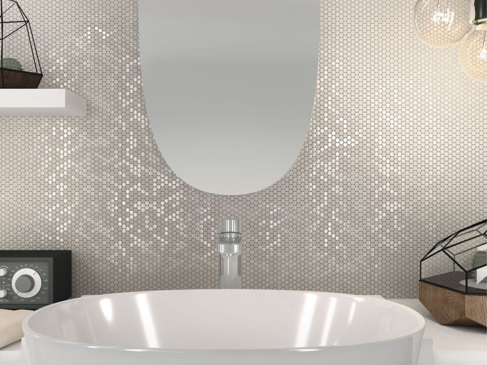 - Плитка под мозаику. Представляет собой цельное изделие с мозаичным рисунком с прорезями. Плитка под мозаику является более бюджетным вариантом, внешне ничем не отличающимся от оригинала.