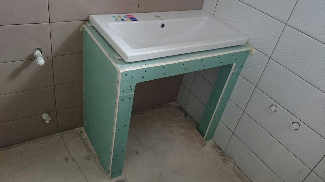 - Гипсокартон. Он недорого стоит, бывает водостойким, а изделия из него смотрятся красиво. Однако, существенным недостатком является его хрупкость, поэтому каркас должен изготавливаться из более прочного материала;