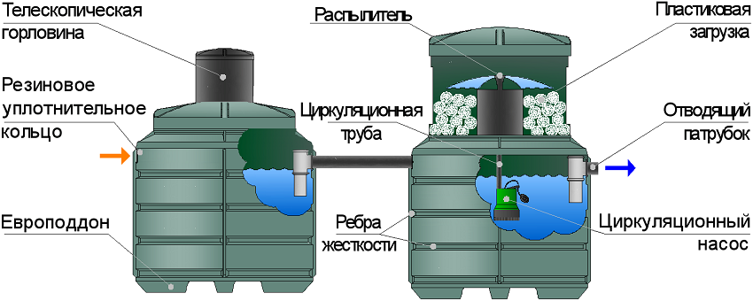 - если предполагается использование очищенной септиком воды, то дополнительно устанавливается емкость для сбора жидкости, в которою будут поступать и далее храниться очищенные воды;