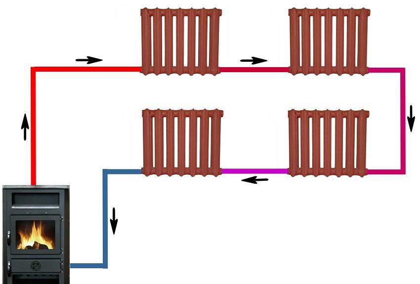Обеспечение теплом в однотрубном контуре осуществляется по-разному. Например, в последовательном подсоединении батарей отопления труба переходит из одного отопительного прибора в последующий, замыкая контур на котле. Или уходит в стояк центрального отопления, где вода снова прогревается. Простой монтаж – единственный плюс, но к котлу возвращается почти холодный теплоноситель, которого недостаточно для обогрева домов большой площади и удаления от котла на большом расстоянии.