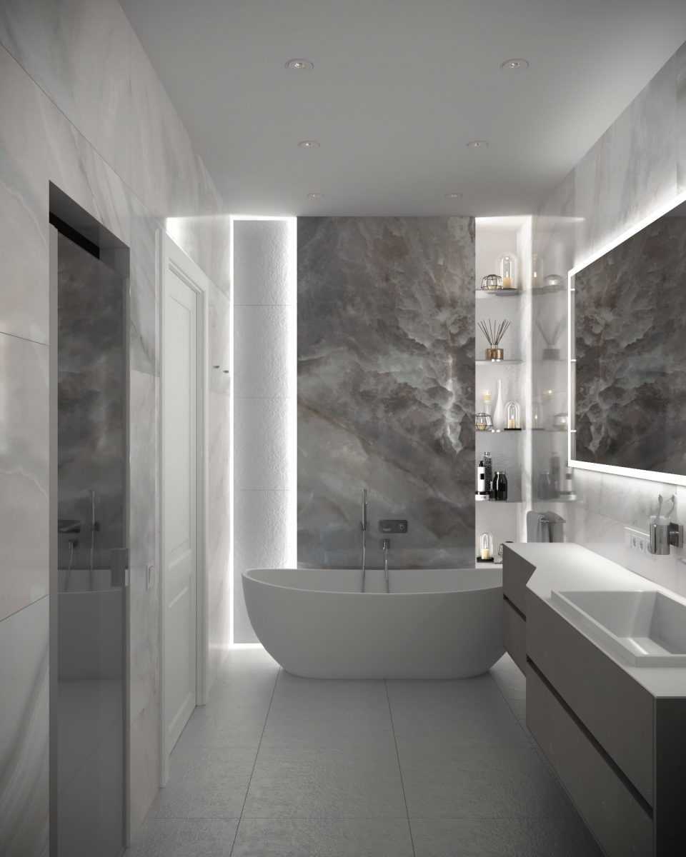Также в таком направлении красиво будет смотреться золотистая ванная из литьевого материала овальной формы. Для современных направлений, таких как минимализм, хай-тек, лофт или модерн, стоит выбрать отдельностоящие, встраиваемые или пристенные модели белого, серого или черного цвета.