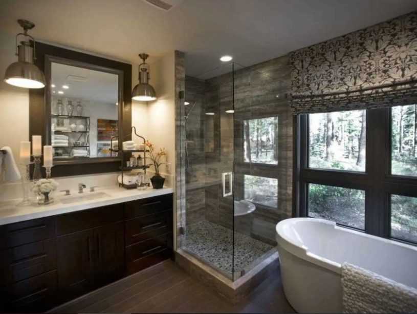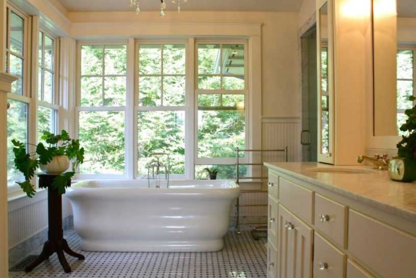 Сразу же оговоримся, что панорамные окна (одно или несколько) это идея для планировки ванной комнаты в частном доме, когда хозяин не ограничен рамками типового проекта, и не вынужден выискивать варианты размещения необходимой мебели и приборов в уже имеющемся пространстве.