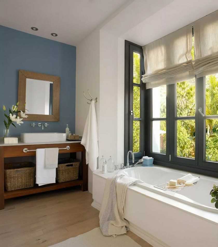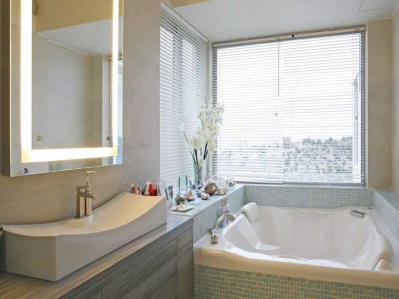Планировка ванной с окном предполагает использование в интерьере комнаты жалюзи, роллетов из влагозащищенных материалов.
