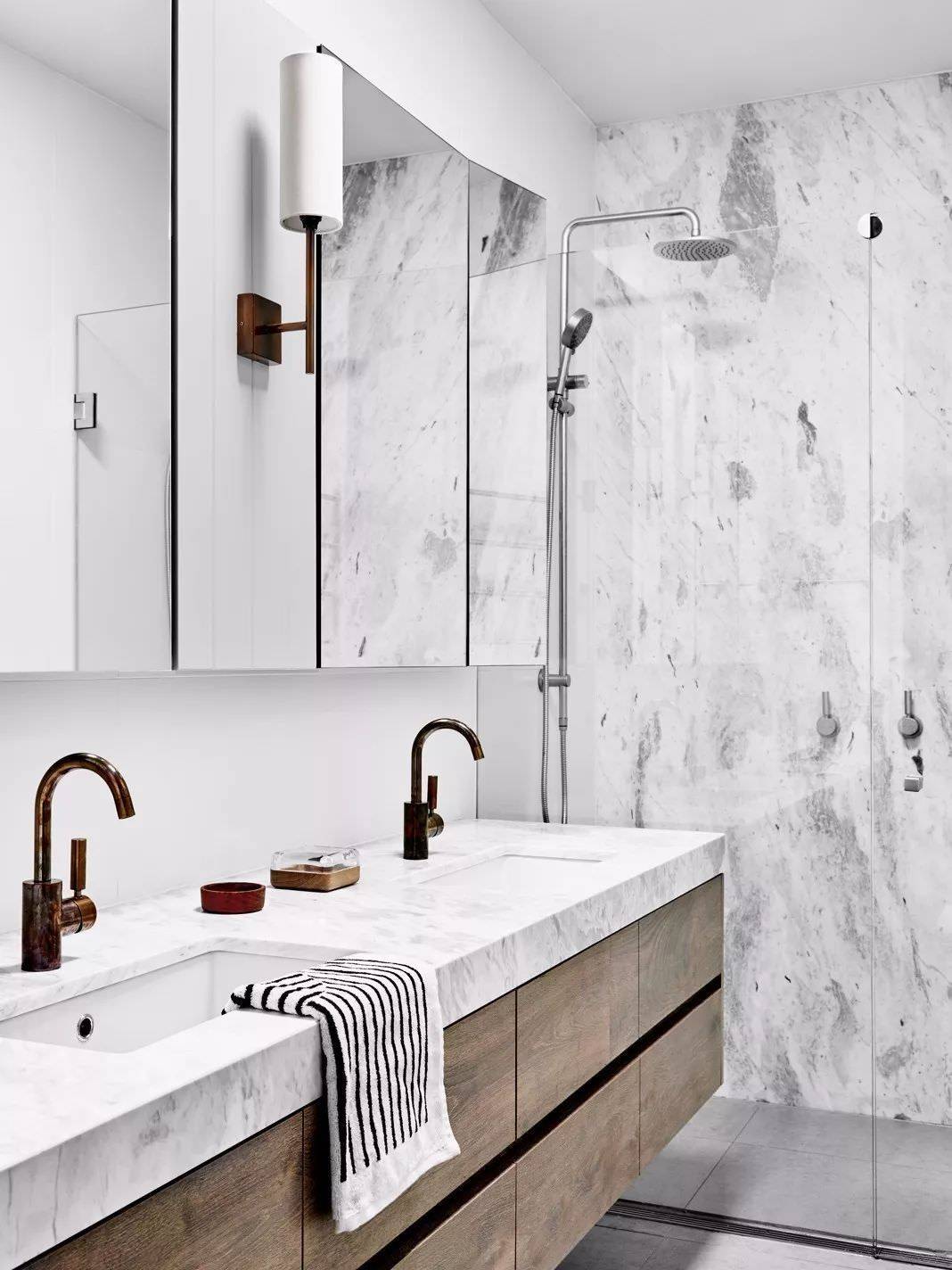 Если вам кажется, что такой «мраморно-золотой» на фото, подход к делу, может утяжелить пространство, используйте в своем дизайне правильное освещение. Галогенки и люстры, которые внешне имитируют свечи, добавят изящества и легкости, а стеклянные дверцы, обилие зеркал прибавят помещению воздушности.