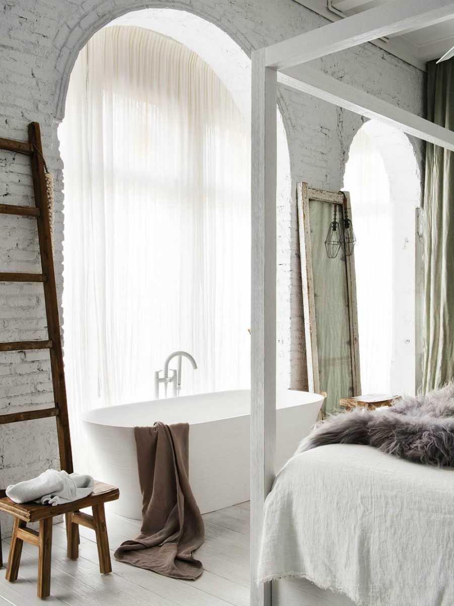 Также довольно часто на практике встречается отделение спальни от ванной при помощи плотных штор. Иногда ванну от спального места не отделяет ничего, а сама ванна устанавливается на небольшой подиум, отделанный кафелем, плиткой-мозаикой, натуральным и декоративным камнем, кирпичом.