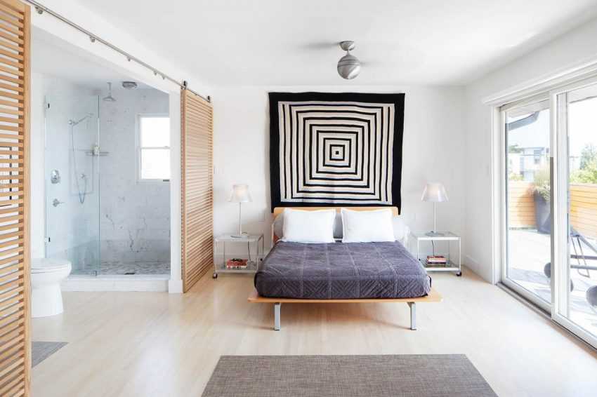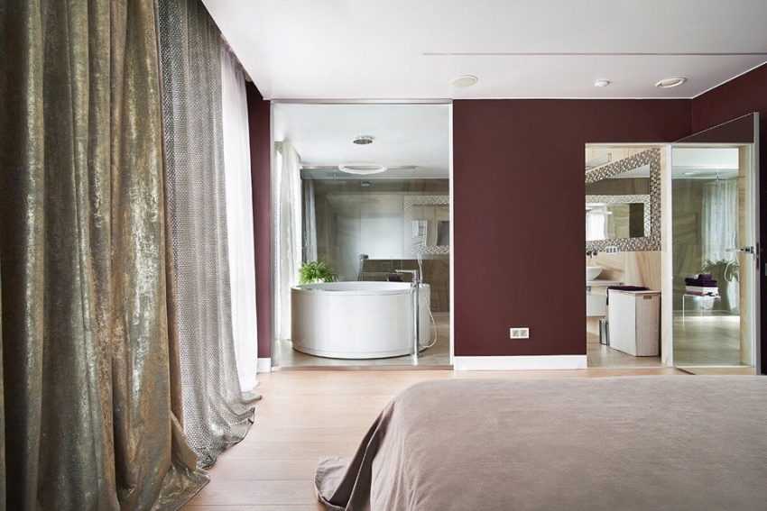 Дизайн спальни, совмещенной с ванной, включает в себя прозрачные раздвижные перегородки из стекла, позволяющие защитить помещение от брызг. Такие перегородки позволяют создать невесомое ограждение, которое не бросается в глаза и не утяжеляет пространства. Отгородить гардероб можно также при помощи перегородок.