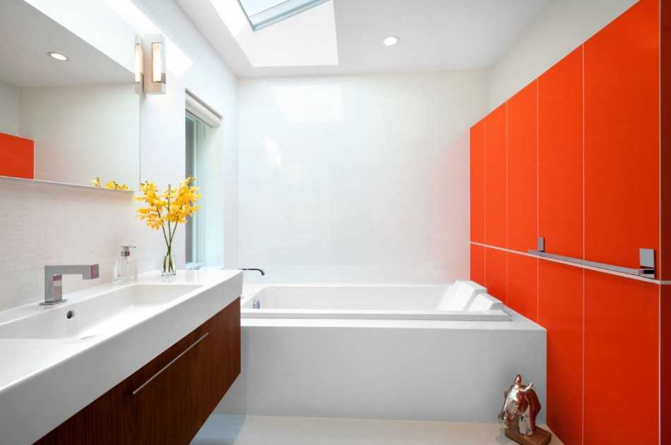 Ванная, отделанная в белых или кремовых тонах, при ярком белом или голубоватом освещении будет отдавать свежестью и бодрить. При оранжевом приглушенном оттенке цвета тот же интерьер приобретет теплый расслабляющий вид.