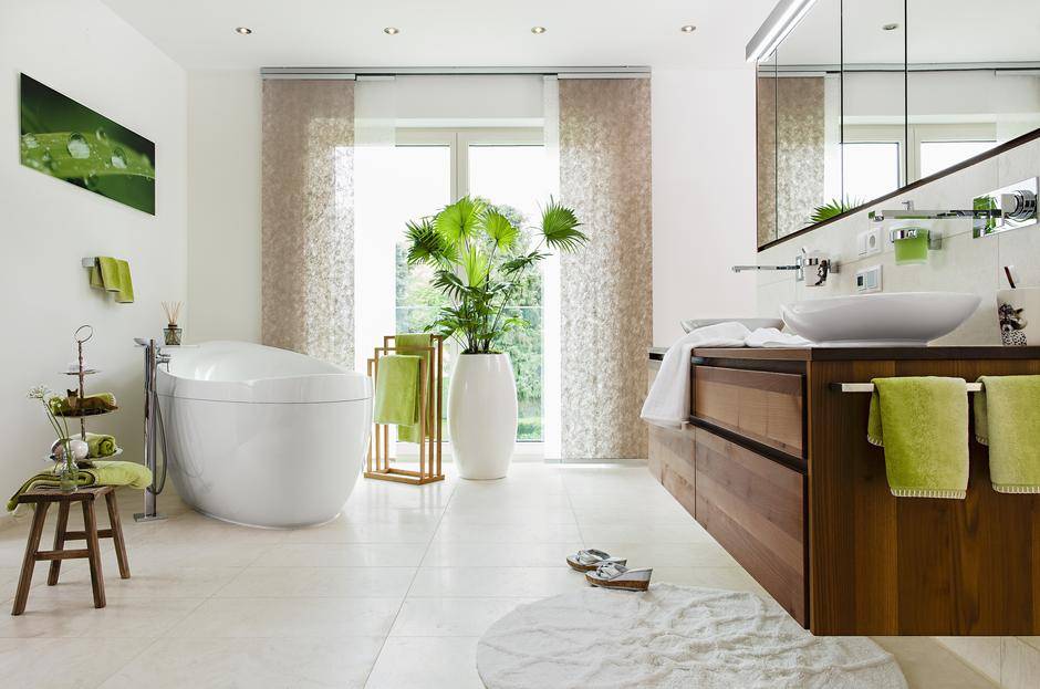 Минимализм, натуральные цвета, простор и много света – так должен выглядеть дизайн ванной комнаты в эко-стиле. Иногда достаточно выбрать лишь правильный облицовочный материал и добавить цветовой акцент с помощью ярких полотенец – и незабываемый образ готов.