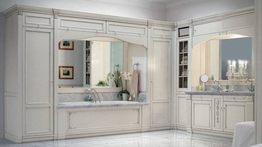 Зеркала в ванную классического стиля обрамляют в багет с богатой резьбой и позолотой. Они считаются одной из главных декоративных «изюминок». Альтернативой служат зеркала, занимающие всю стену над умывальником, по обеим сторонам которых располагаются полки или вертикальные пеналы.