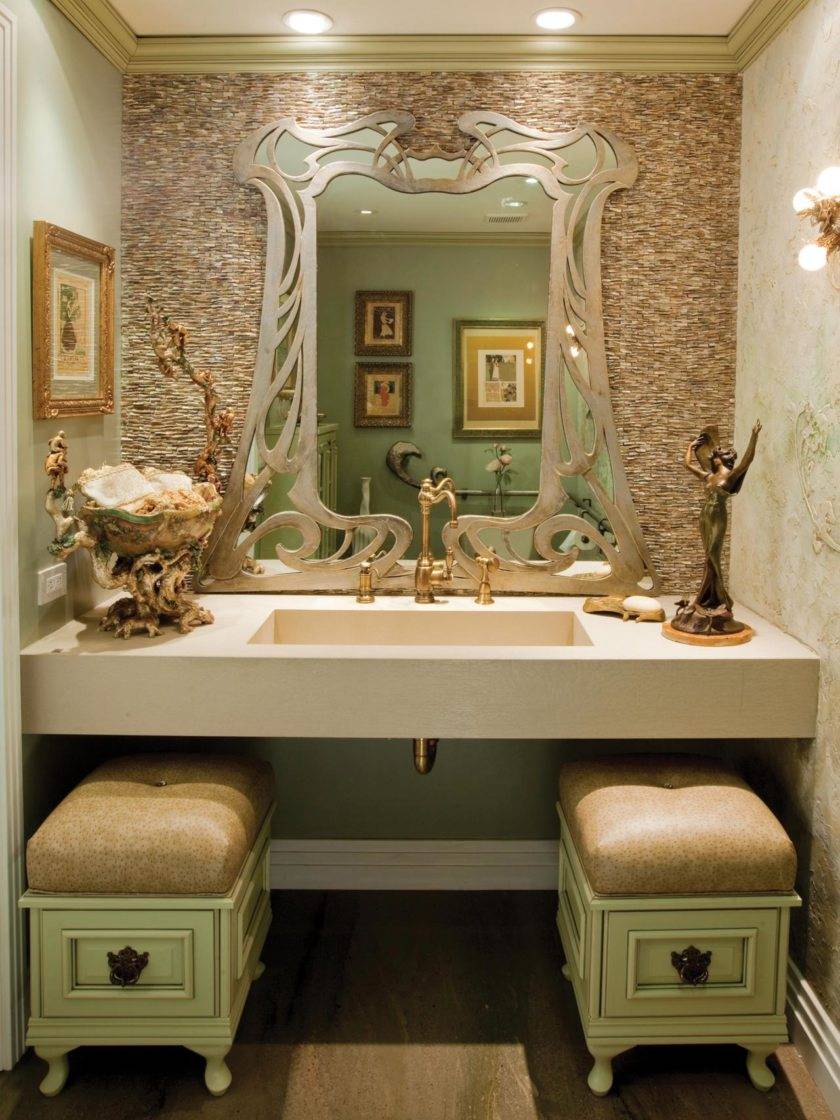 Зеркало в ванную — отдельная тема. Скорее всего оно будет в раме — старинной деревянной раме с резным декором или с позолотой в оформлении. Зеркал может быть два или три. Прямоугольное, круглое, фигурное — ассортимент потрясает воображение!
