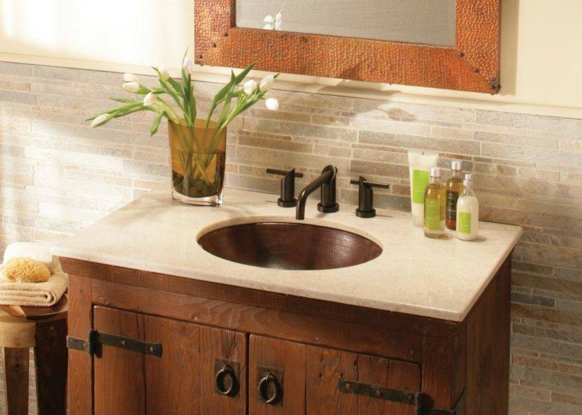 - Деревянная столешница в ванной комнате может быть изготовлена из массива дерева или клееного ламинированного дерева (и из-за своих свойств это более рекомендуется).