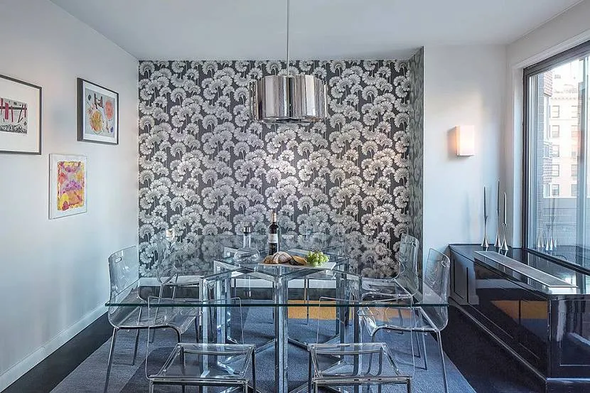 Необычный дизайн отлично смотрится в прозрачной и отражающейся кухне. Серый орнамент из фотообоев дает визуальную глубину комнате. Акценту на стене соответствует светильник, напольное покрытие и рабочая зона. Все они похожи оттенками, подчеркивают богатство и шик.