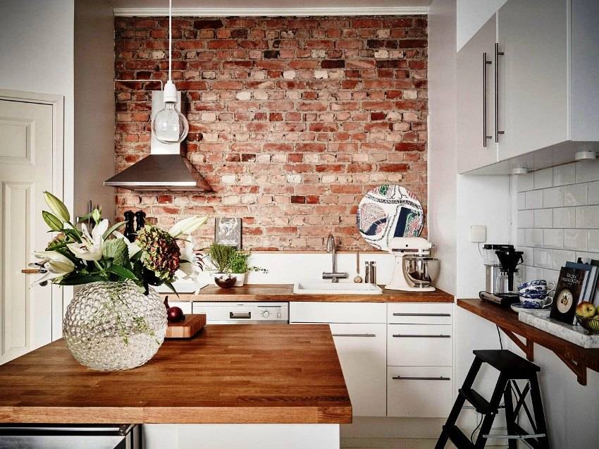 Существует масса различных вариаций декоративного оформления кухонных стен. Кирпичная стена больше соответствуют стилю лофт. Приемлема и в других направлениях интерьера. Ее могут выполнять из настоящего материала или делать имитацию. В любом случае такая поверхность поддается различному декорированию картинами, фото или часами. Не нужно бояться делать такую перегородку функциональной: она отлично подходит для размещения вытяжки.
