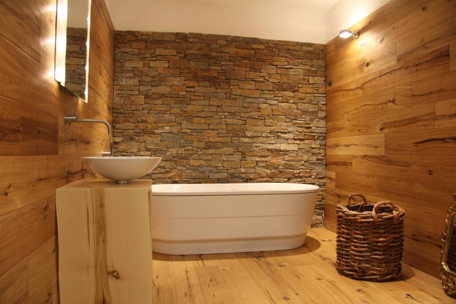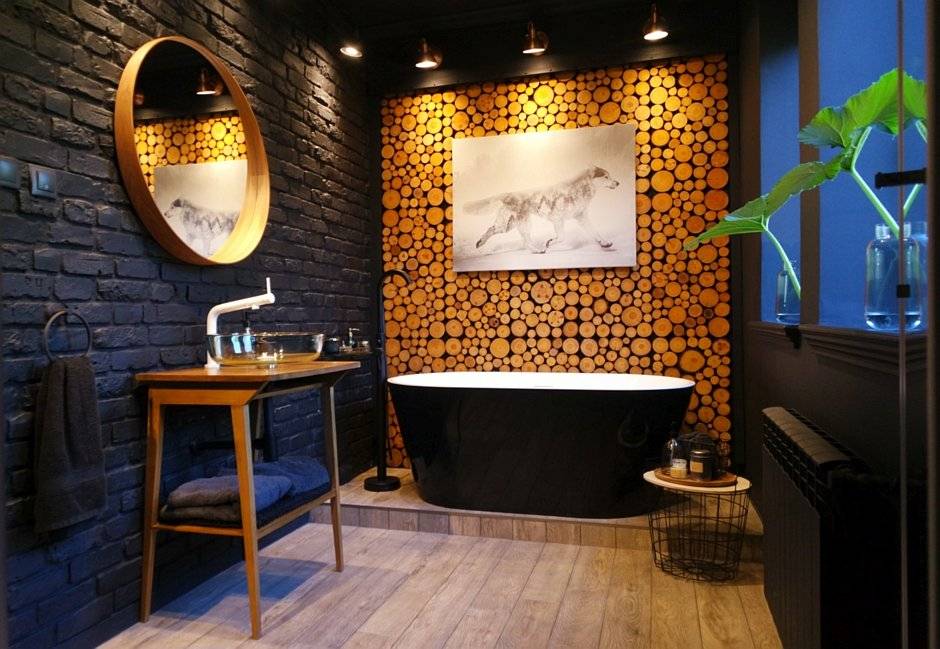 Используя дерево для отделки ванной комнаты, можно создать иллюзию пребывания на природе, ведь его аромат наполняет собой все помещение. Одними из самых распространенных отделочных материалов являются дубовые и кедровые покрытия. Благодаря прочной структуре дерева они могут долго прослужить даже при большой влажности.