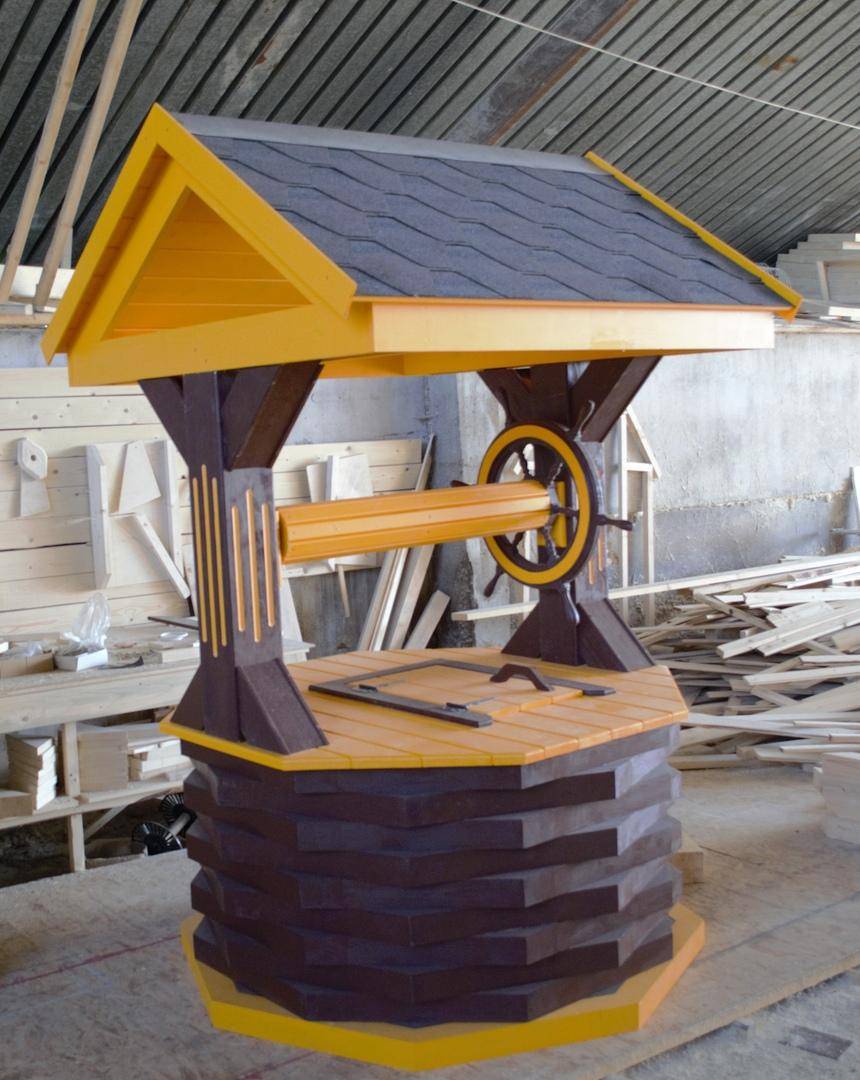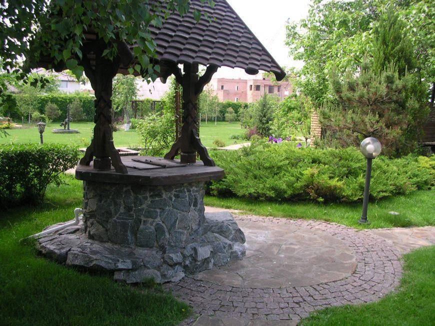 Дерево. Особенно красивы резные и искусственно состаренные декоративные колодцы.
