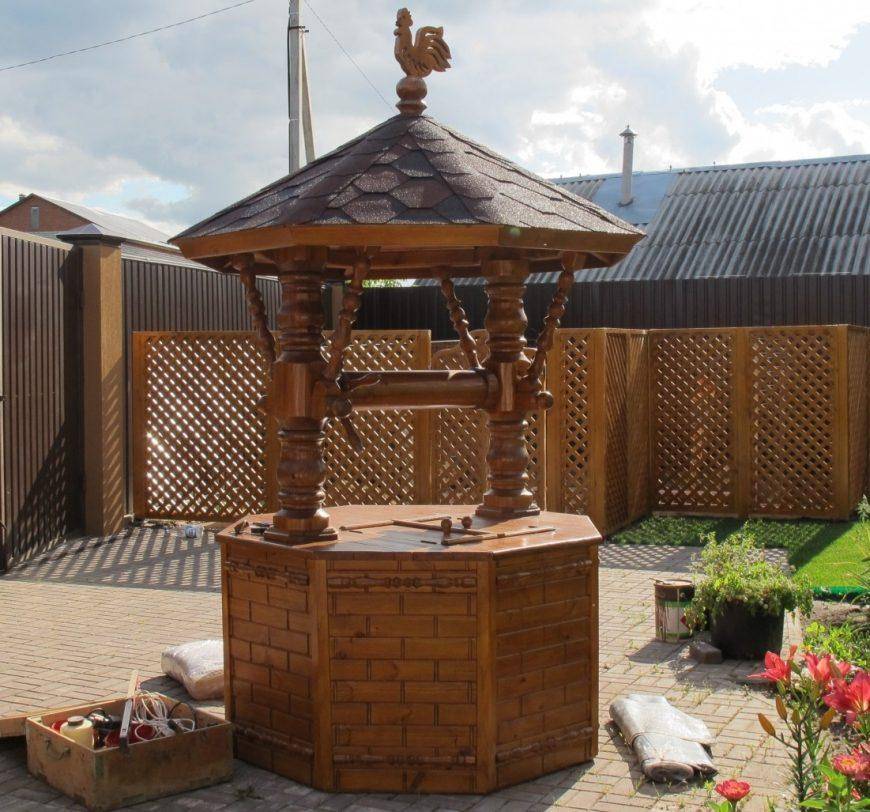Достоинство деревянных конструкций в том, что необязательно повторять конфигурацию круглого колодца. Можно сделать квадратную или многоугольную облицовку. Она гармонично сочетается с элементами резьбы по дереву, что придает конструкции выразительный русский стиль.