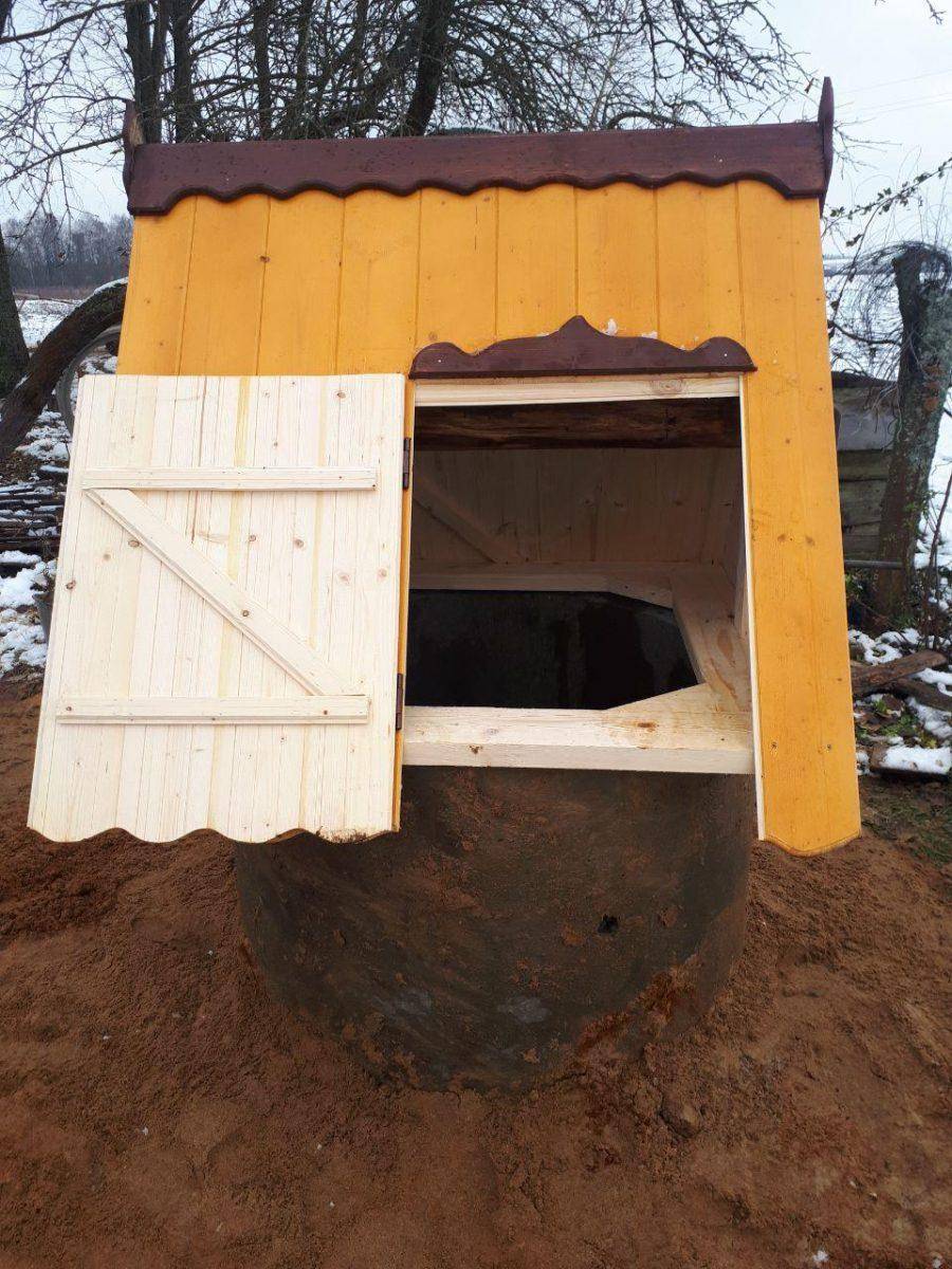 Собирается деревянный каркас и крепится в верхней части кольца. После чего из доски делается плотный поддон с крышкой. Наверху сооружается крыша с качественной кровлей. Расстояние между окончанием кровли и поддоном зашивается при помощи деревянных реек или другого материала.
