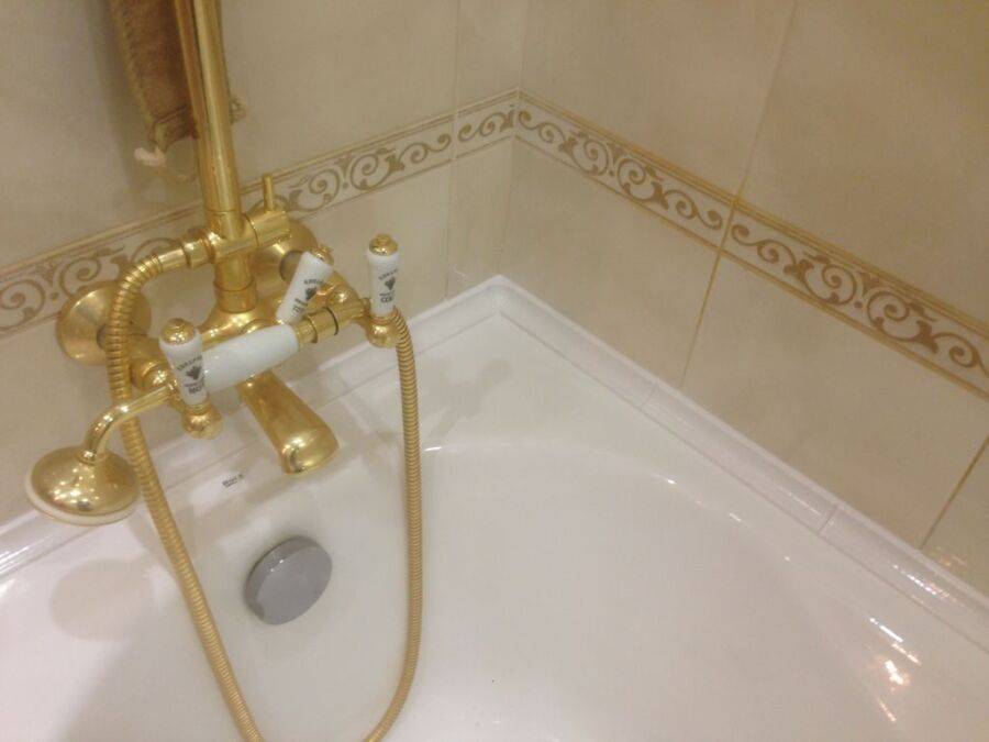 Такая схема выполнения работ позволяет полностью устранить расстояние между ванной и стеной. В результате нарушения порядка образуется зазор, который при наличии кривых стен может достигать в ширину нескольких сантиметров. Именно для таких случаев лучшим решением является использование керамического или пластикового бордюра для ванной, который не только скроет зазор, но и станет надежным барьером для проникновения воды.