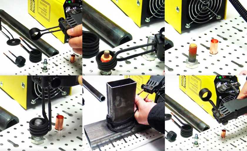Индукционная катушка нагревает металл (трубу или куски проволоки), помещенные внутри нее, с помощью высокочастотных вихревых токов, контакт не обязателен