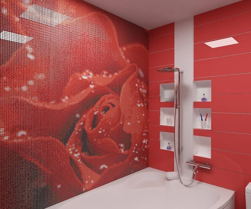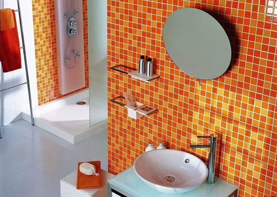Мелкие плиточки помогают выделить части стенок. Они могут применяться для оклейки экрана, выкладки нижней половины стен, их разделения (выкладываются тонкой или широкой полоской). Подходят для декорирования пространства над плинтусами, заполнения ниш, выделения душевых зон.