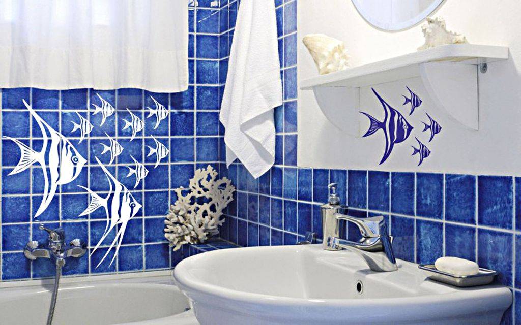 - Самыми распространёнными виниловыми наклейками, применяемыми в ванной, являются стикеры с водной тематикой. Это разнообразные изображения морских обитателей, воды и всё что с ней связано.