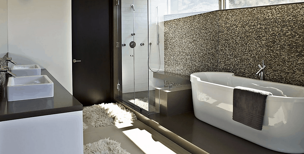 Дизайнеры делят комнату при помощи осветительных приборов или многоуровневого пола, акцентируя внимание на деталях обстановки. Чтобы придать роскоши санузлу, можно выбрать сантехнику, выполненную из камня