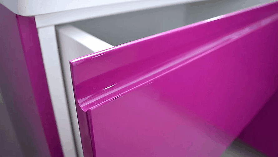 Для окрашивания используется высокопрочные водостойкие эмали на основе акрила или полиуретана, последние отличаются особой пластичностью. Процесс окраски проходит в несколько этапов, каждый из которых повышает влагозащитные свойства мебельного гарнитура – грунтовка, послойное окрашивание, лакирование. Самое главное, что окрашиванию подвергаются не только фасадные части, но и тыльные и торцевые. Краска идеально ложится на любую поверхность – ровную, изогнутую и рельефную. Покрытие получается монолитным, благодаря чему вероятность попадания влаги в структуру материала полностью сведено на нет.