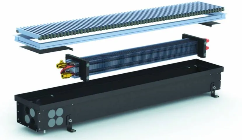 - Плинтусные. Устройства располагаются по периметру помещения, прикрываются декоративными плинтусами вдоль стены или остаются с открытыми корпусами. Теплообменник подключается параллельно или последовательно, все зависит от типа магистрали и удобства пользователей. Труба теплообменника защищается перфорированным корпусом из стали, алюминия. Компактное оборудование помогает поддерживать баланс температуры и влажности.