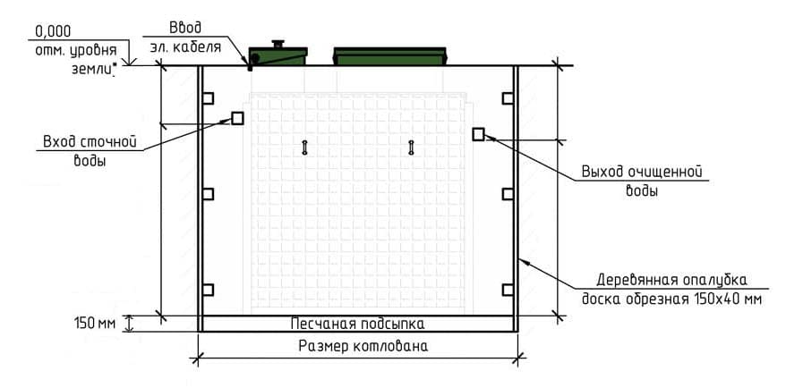 Септик устанавливается в заранее подготовленный котлован согласно монтажной схеме. При нормальных условиях достаточна установка на плотный материковый грунт с подсыпкой песчаного подстилающего слоя толщиной 100 мм. Также возможна установка ниже уровня грунтовых вод без заливки бетоном.