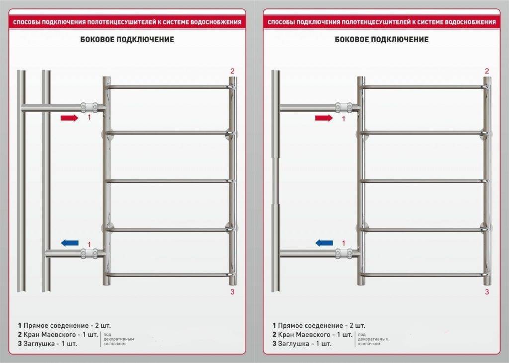 Монтаж полотенцесушителя с боковым подключением немного сложнее, зато выглядит он очень эстетично