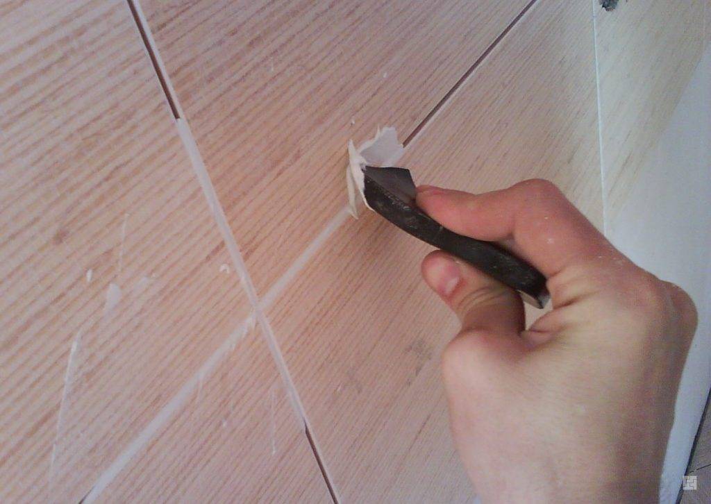 Чтобы ремонт был закончен, а комната приобрела опрятный вид, удаляют излишки высохшей мастики. Так как во время высыхания смесь проседает, то затирают швы в несколько приемов. Только после окончательного высыхания удаляют остатки.