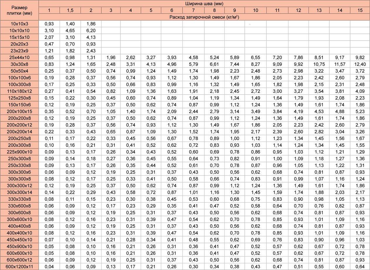 Расход затирки для обработки 1м² площади составляет 0,5-1,5 кг (без учета потерь при работе). Ширина заполняемого шва может составлять 2-10 мм. Например, при ширине и глубине шва 10 мм на 1м² потребуется 1,1-1,5 кг затирки. При укладке плитки большего размера потребуется меньше материала.
