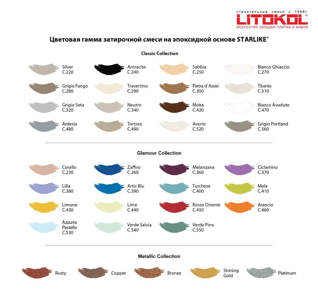Если же на первом месте стоит презентабельность и эстетика, то используйте эпоксидную затирку “Литокол”. Эта линейка характеризуется богатой цветовой гаммой и оптимально подходит для создания элитных и дизайнерских интерьеров.